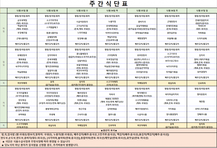 2025년 12월 첫째주 식단표 작성자 최고관리자 댓글 0건 조회 25회 작성일 25-12-01 08:50 . 목록 이전글2025년 12월 둘째주 식단표 25.12.06 다음글2025년 11월 넷째주 식단표 25.11.22