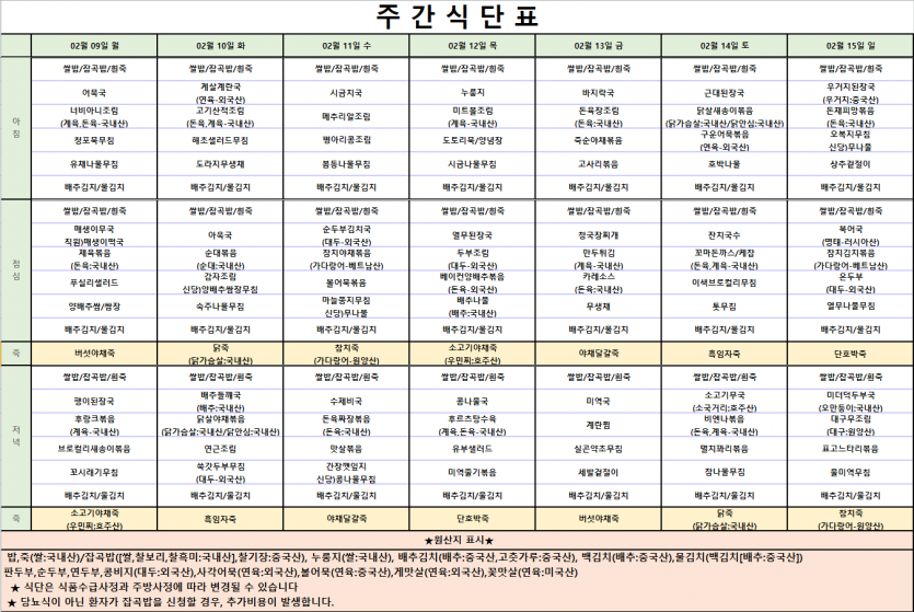 2026년 2월 첫째주 식단표