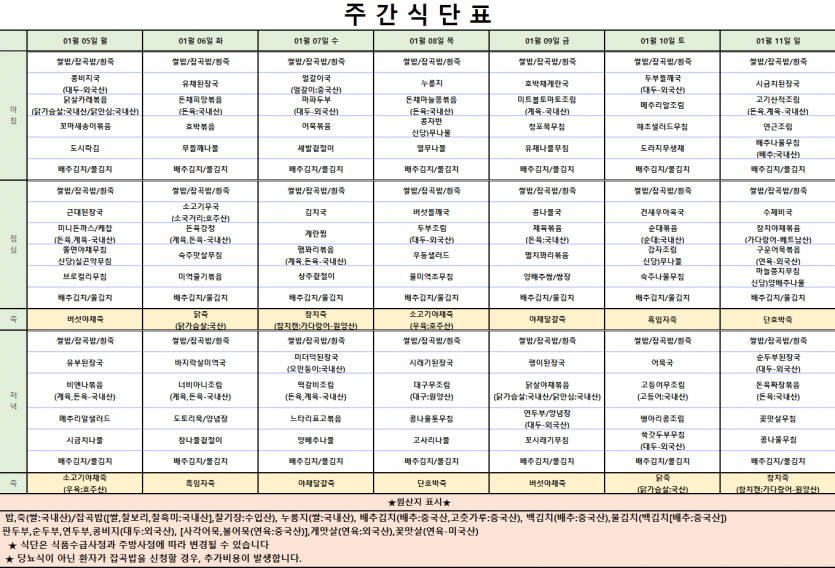 2026년 1월 첫째주 식단표 작성자 최고관리자 댓글 0건 조회 42회 작성일 26-01-03 11:42 . 목록 이전글2026년 1월 둘째주 식단표 26.01.10 다음글2025년 12월 다섯번째주 식단표 25.12.27