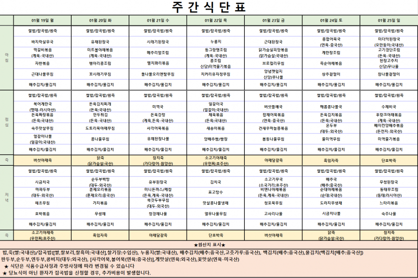2026년 1월 셋째주 식단표 작성자 최고관리자 댓글 0건 조회 48회 작성일 26-01-17 15:22 . 목록 이전글2026년 1월 넷째주 식단표 26.01.24 다음글2026년 1월 둘째주 식단표 26.01.10