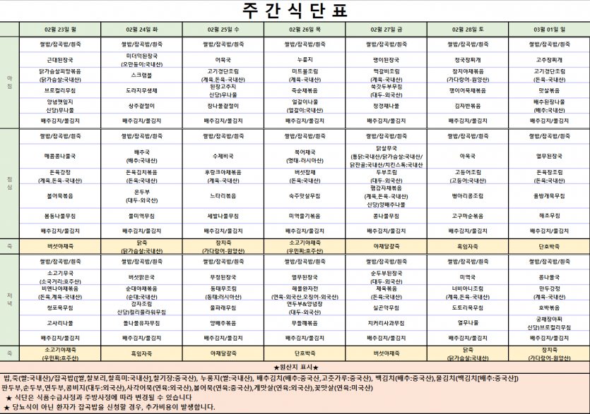 2026년 2월 넷째주 식단표 작성자 최고관리자 댓글 0건 조회 40회 작성일 26-02-21 16:21 . 목록 이전글2026년 3월 첫째주 식단표 26.02.28 다음글2026년 2월 셋째주 식단표 26.02.14