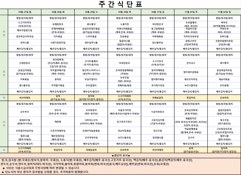 2025년 10월 다섯번째주 식단표 작성자 최고관리자 댓글 0건 조회 60회 작성일 25-10-25 14:29 . 목록 이전글2025년 11월 첫째주 식단표 25.11.01 다음글2025년 10월 넷째주 식단표 25.10.18