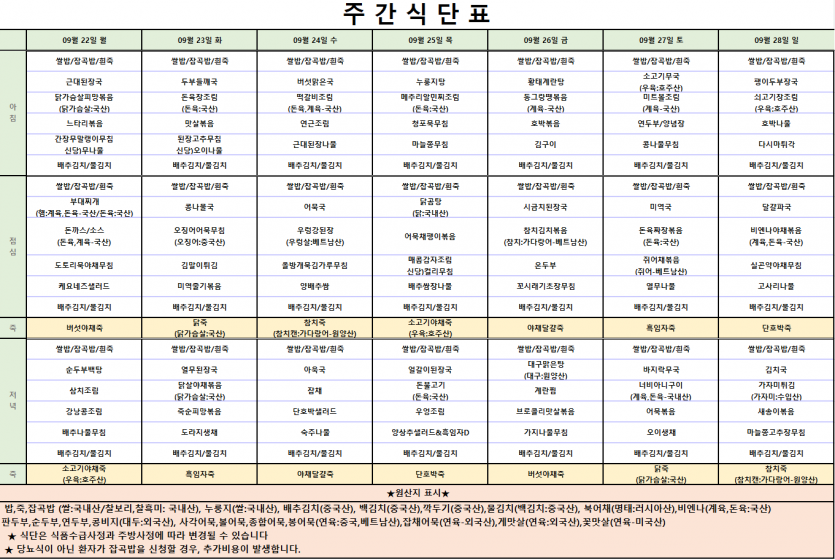 2025년 9월 넷째주 식단표 작성자 최고관리자 댓글 0건 조회 109회 작성일 25-09-20 13:37 . 목록 이전글2025년 10월 첫째주 식단표 25.09.27 다음글25년 9월 셋째주 식단표 25.09.13